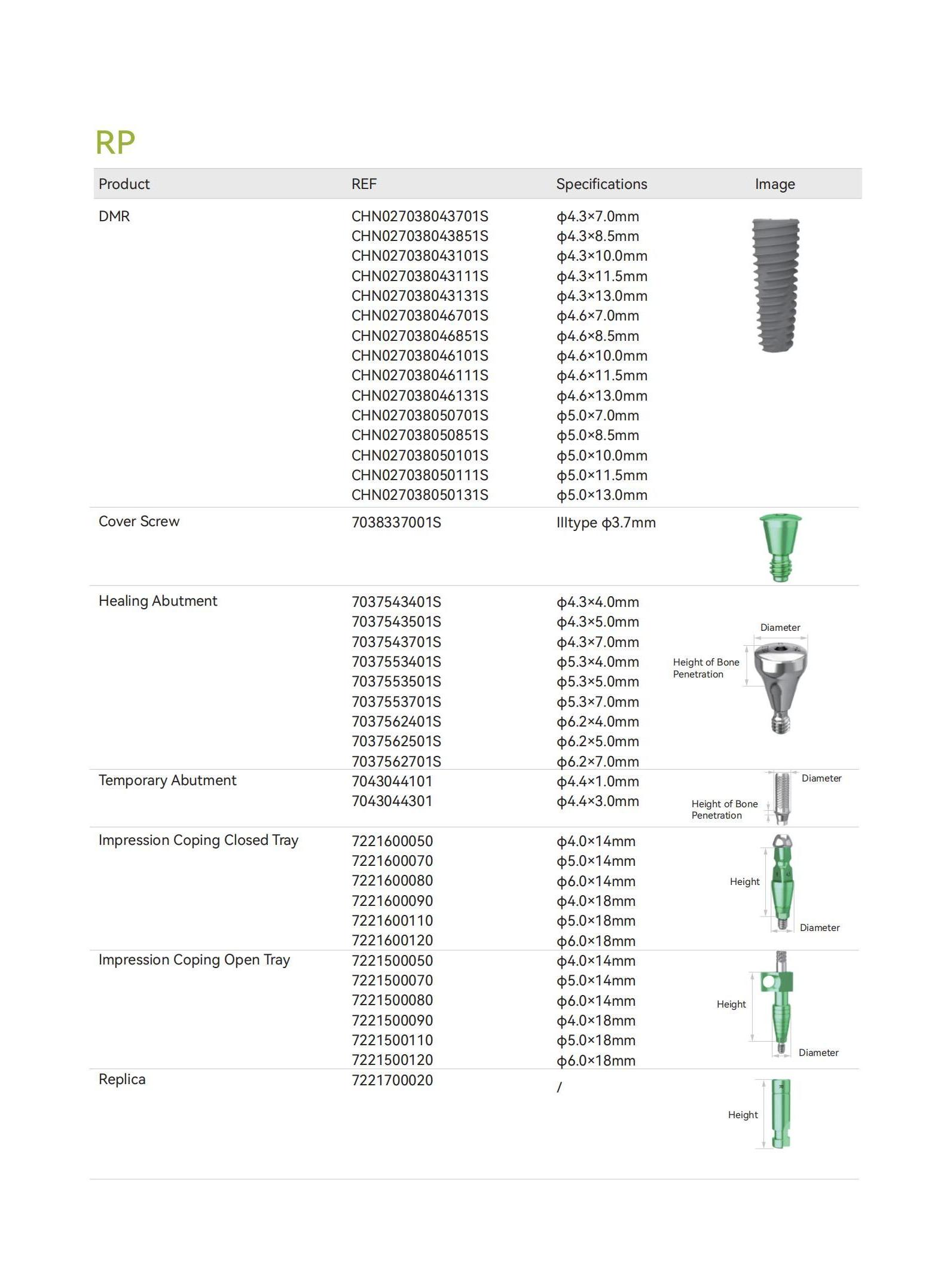 Titanio de trabajo en frío preferido grado 4 Mediante un proceso especial de trabajo en frío, nuevo titanio de trabajo en frío El grado 4 se forma con mejor biocompatibilidad, mayor resistencia mecánica y mayor durabilidad, a la vez que es compatible con el titanio puro. Después de 5 millones de pruebas, la resistencia a la tracción de la materia prima del implante es superior a 900 MPa. Se obtienen un mayor límite elástico y resistencia mediante un tratamiento especializado de trabajo en frío. Especificaciones: Implante DMR, NP Ï3,75 Ã8,5 mm Implante DMR, NP Ï3,75 Ã10,0 mm Implante DMR, NP Ï3,75 Ã11,5 mm Implante DMR, NP Ï3,75 Ã13,0 mm Implante DMR, RP Ï4,3 Ã7,0 mm Implante DMR, RP Ï4,3 Ã8,5 mm Implante DMR, RP Ï4,3 Ã10,0 mm Implante DMR, RP Ï4,3 Ã11,5 mm Implante DMR, RP Ï4,3 Ã13,0 mm Implante DMR, RP Ï4,6 Ã7,0 mm Implante DMR, RP Ï4,6 Ã8,5 mm Implante DMR, RP Ï4,6 Ã10,0 mm Implante DMR, RP Ï4,6 Ã11,5 mm Implante DMR, RP Ï4,6 Ã13,0 mm Implante DMR, RP Ï5,0Ã7,0 mm Implante DMR, RP Ï5,0Ã8,5 mm Implante DMR, RP Ï5,0Ã10,0 mm Implante DMR, RP Ï5,0Ã11,5 mm Implante DMR, RP Ï5,0Ã13,0 mm